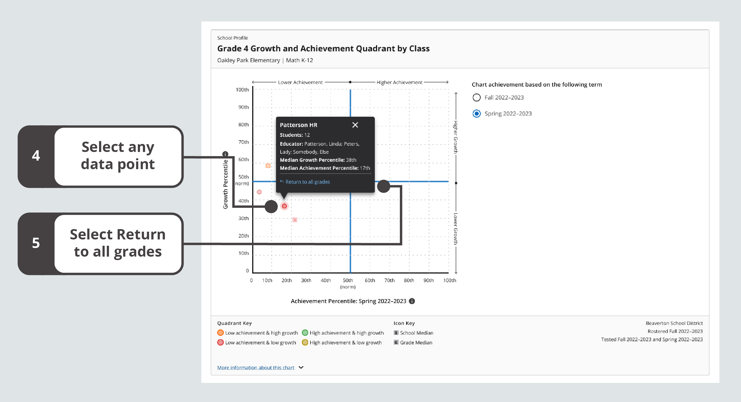 Steps for accessing the Growth and Achievement Quadrant and selecting a term for achievement data