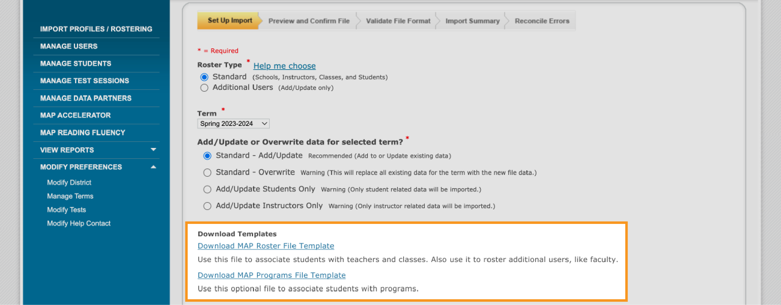 From the Import Profiles/Rostering page, select Access NWEA Legacy Rostering to access the Set Up Import screen on the Import Profiles/Rostering page.