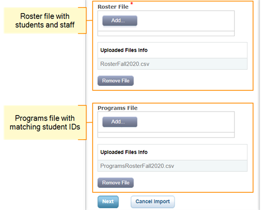 On the Set Up Import screen, add both the Roster File (teacher and students) spreadsheet and the MAP Programs File.