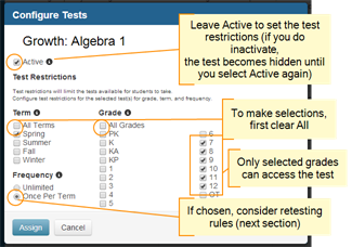 If you restrict a test to Once Per Term, the following retesting rules take effect. These district‑wide rules allow exceptions so that students can still retest under appropriate circumstances.