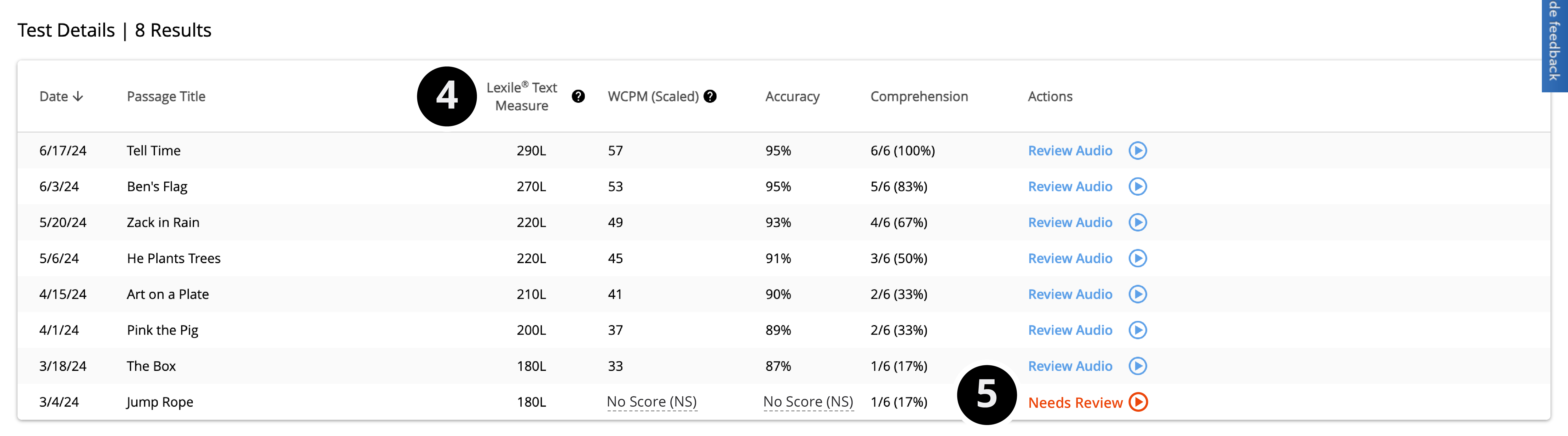4. Review the Lexile Text Measure for the passage read, along with student results for WCPM (scaled), accuracy, and comprehension.