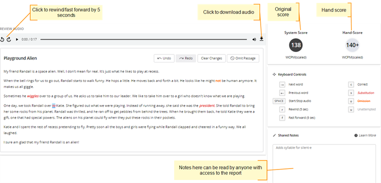 The best way to correct for these edge cases is as follows. If the recording is comprehensible but was assigned a “NS” by the system, use the hand-scoring features to determine the word-level errors. The hand-scored results will then populate in reporting. If a recording is not comprehensible, select “omit passage” to exclude a poor recording from overall reports.